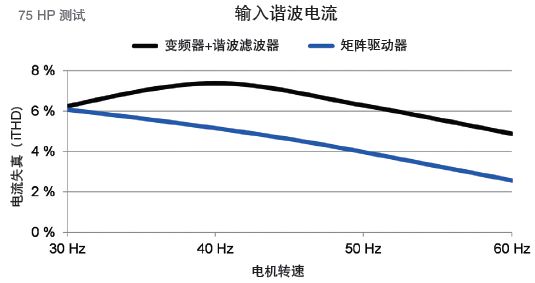 低输入电流谐波性能是使用矩阵技术进行功率转换的关键优势。在操作电机时,电流从低谐波电平的线路中引出。通常情况下,矩阵驱动器的运行其谐波要低于变频器输入端总谐波失真(THD)的5%。输入滤波器可减轻传统变频器产生的谐波。矩阵驱动在整个负载曲线中的谐波,始终低于带有谐波滤波器的变频器的谐波。