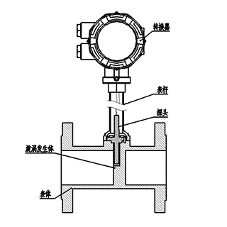 涡街流量计的基本结构如图1-2和1-3所示,它主要由表体、探头、旋涡发生体、表杆和转换器等组成。
